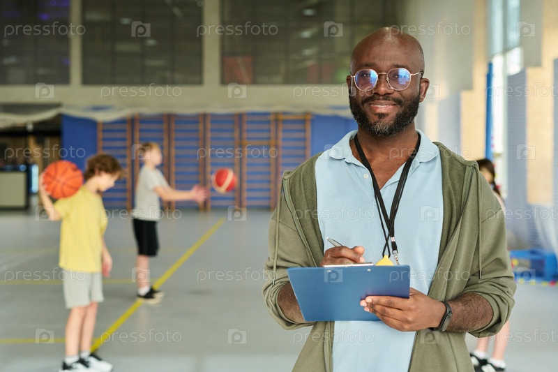 Портрет чернокожего мужчины, тренирующего подростков во время баскетбольной практики
