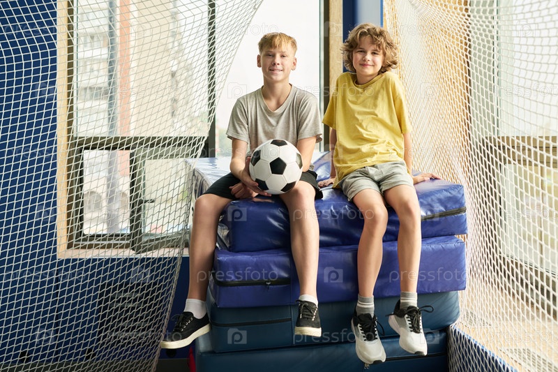 Мальчики-подростки сидят в помещении, держа футбольный мяч и улыбаются вместе