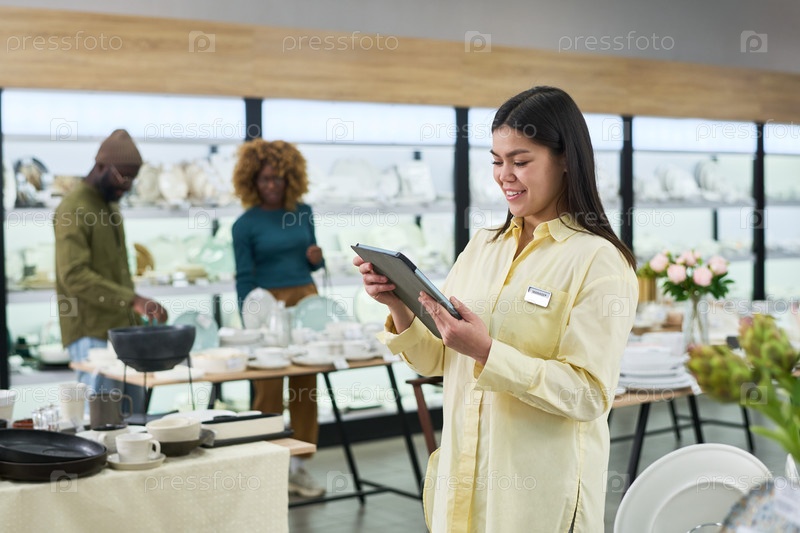 Молодая взрослая женщина использует цифровой планшет в современном магазине настольной посуды
