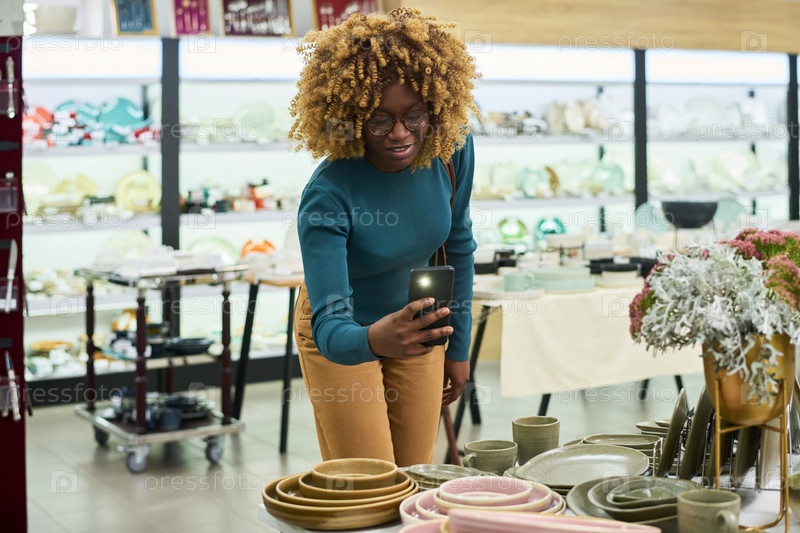 Молодая взрослая чернокожая женщина фотографирует настольную посуду в магазине