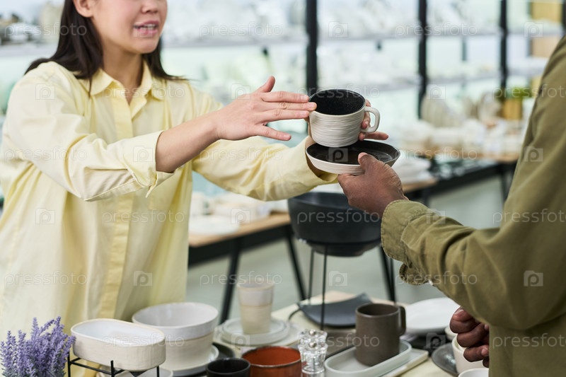 Молодая взрослая женщина вручает мужчине керамический кубок в помещении