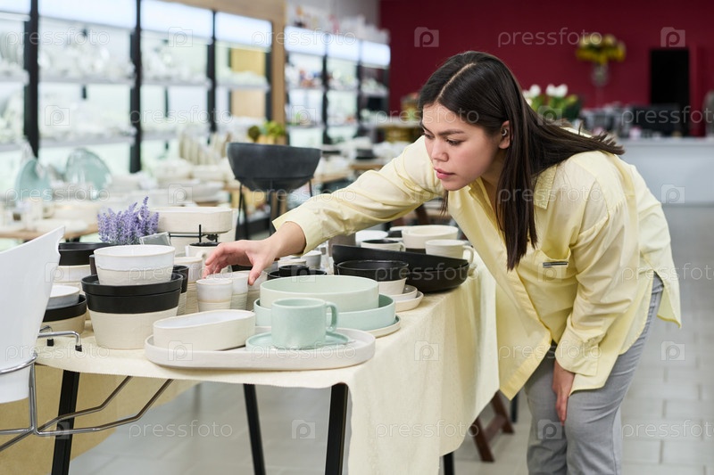 Молодая взрослая женщина устраивает керамическую посуду в интерьере магазина