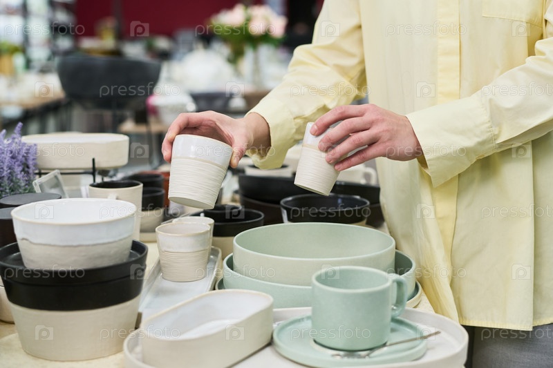 Неизвестная женщина устраивает керамические столовые принадлежности на витрине магазина