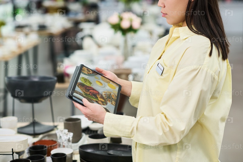 Молодая женщина использует цифровой планшет, стоя в магазине