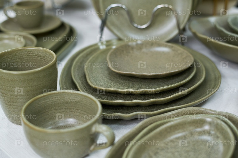 Набор керамической посуды с тарелками, мисками и чашками, расположенными на столе