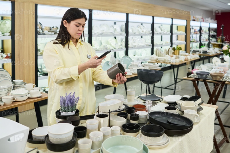 Молодая женщина сканирует керамическую посуду со смартфоном в магазине