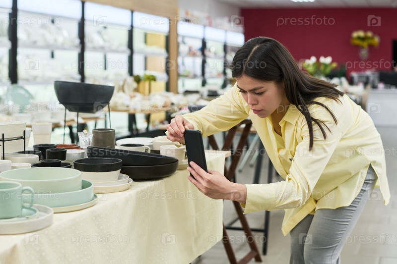 Молодая женщина фотографирует настольный экран в интерьере магазина