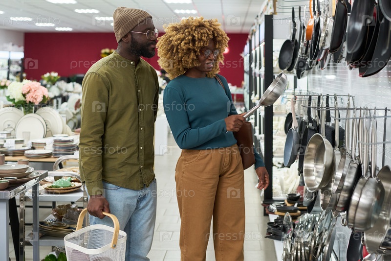 Молодая черная пара покупает кулинарные принадлежности в магазине продуктов для кухни