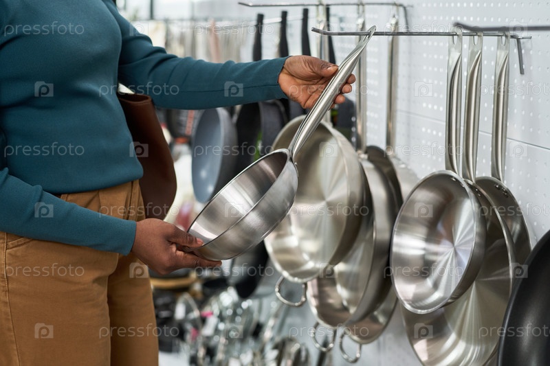 Неизвестная чернокожая женщина выбирает плиту из нержавеющей стали в магазине кухонных принадлежностей