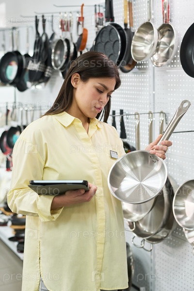 Молодая женщина сравнивает сковородки во время покупок в магазине