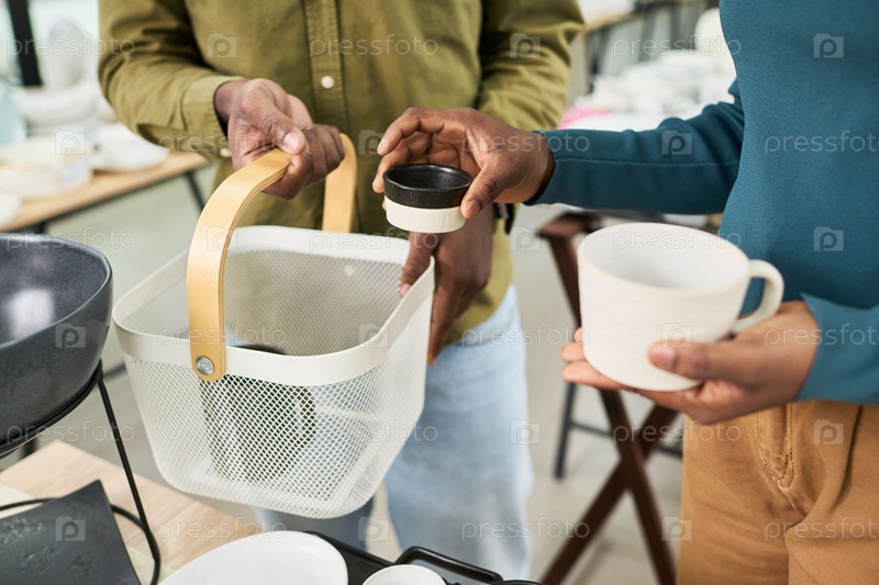 Неизвестная пара вместе покупает керамическую посуду в помещении