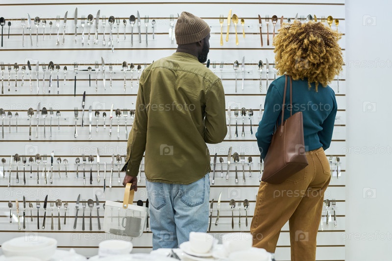 Молодой взрослый чернокожий мужчина и женщина вместе покупают кухонные принадлежности