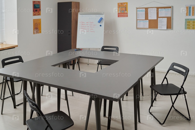 Пустой класс, организованный для тюремной образовательной программы с учебными материалами