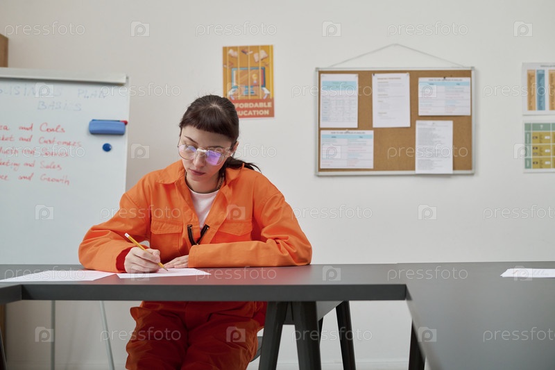Молодая взрослая женщина учится в классе во время тюремной образовательной программы