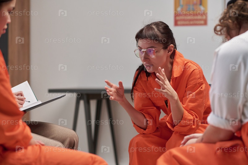 Молодая женщина-узница объясняет проблему во время сеанса тюремной терапии