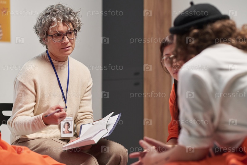 Женщина среднего возраста содействует групповой дискуссии во время сеанса тюремной терапии