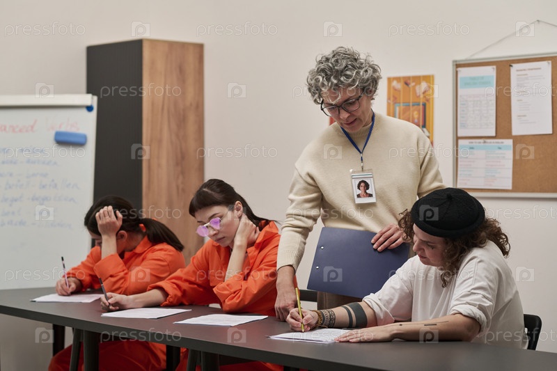 Учитель среднего возраста помогает различным заключенным-женщинам учиться