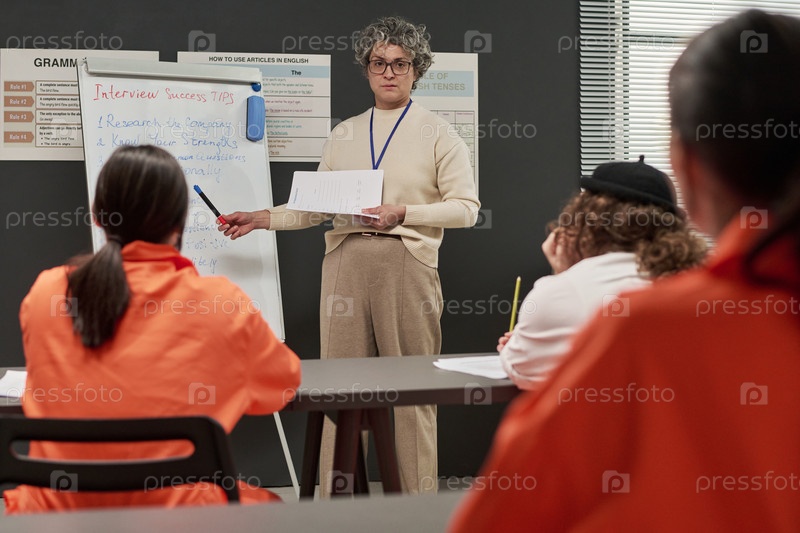 Женщина среднего возраста, облегчающая обучение рабочим навыкам для заключенных женщин