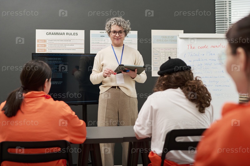 Мужчина среднего возраста преподает тюремный образовательный класс для заключенных-женщин