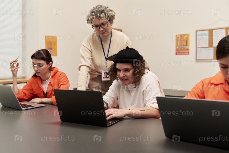 Женщина среднего возраста обучает разных молодых взрослых использовать ноутбуки