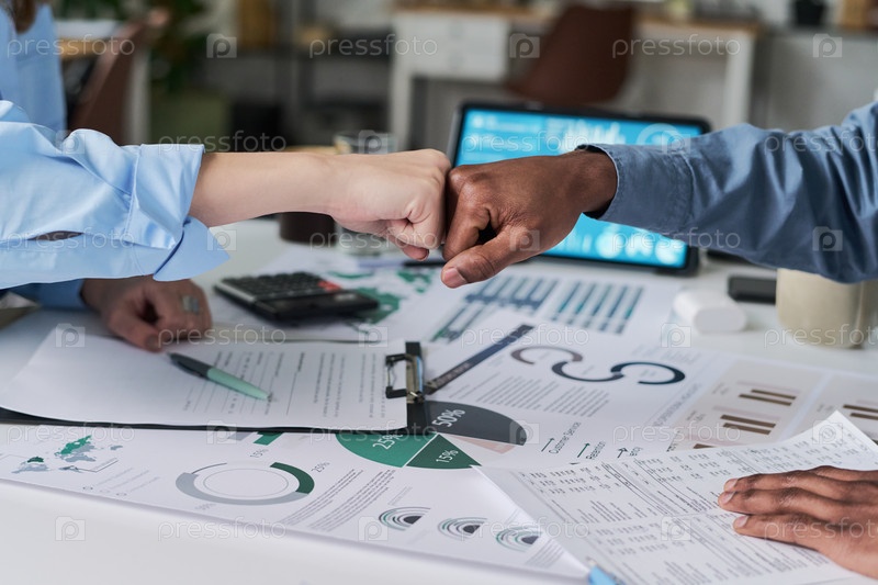 Женщина и чернокожий мужчина сотрудничают и бьются кулаками в офисе