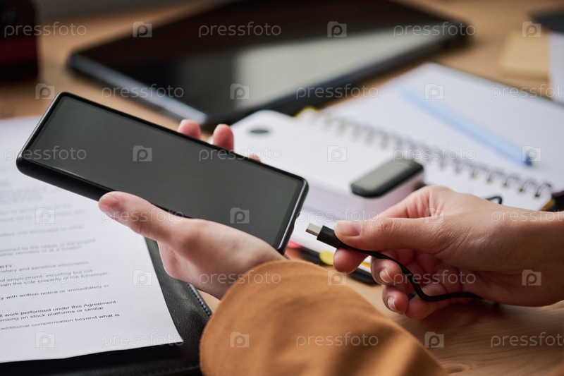 Молодая взрослая женщина подключает смартфон к кабелю для зарядки на рабочем столе