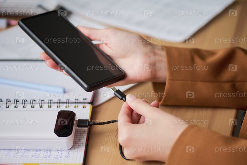 Женщина подключает смартфон к Power Bank во время учебы