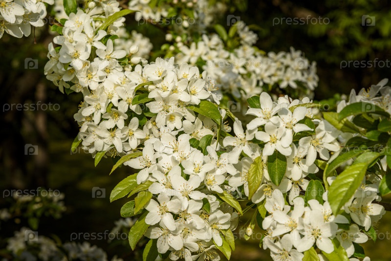 Нежные белые цветы на фоне зеленых листьев в тихом саду