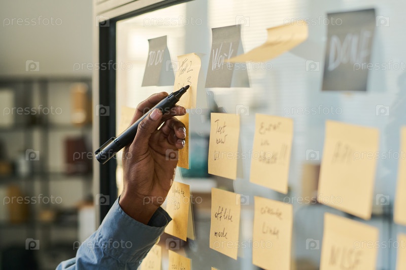 Молодой взрослый чернокожий мужчина пишет заметки на клейких записках во время офисного мозгового штурма