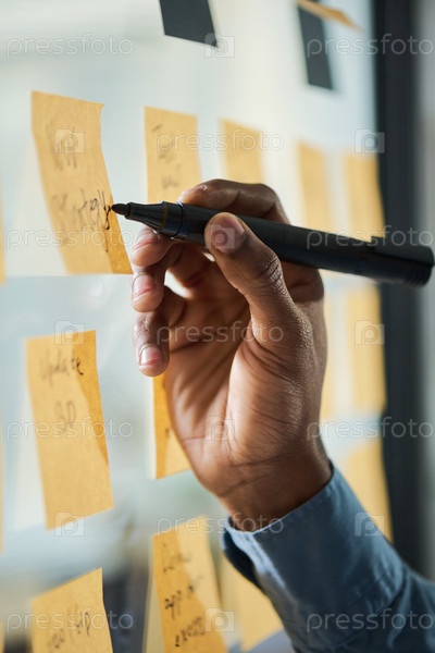 Ключевое изображение молодого взрослого чернокожего мужчины, пишущего заметки на клейких записках во время планирования