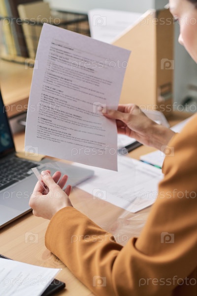 Молодая взрослая женщина просматривает документы, сидя за рабочим столом