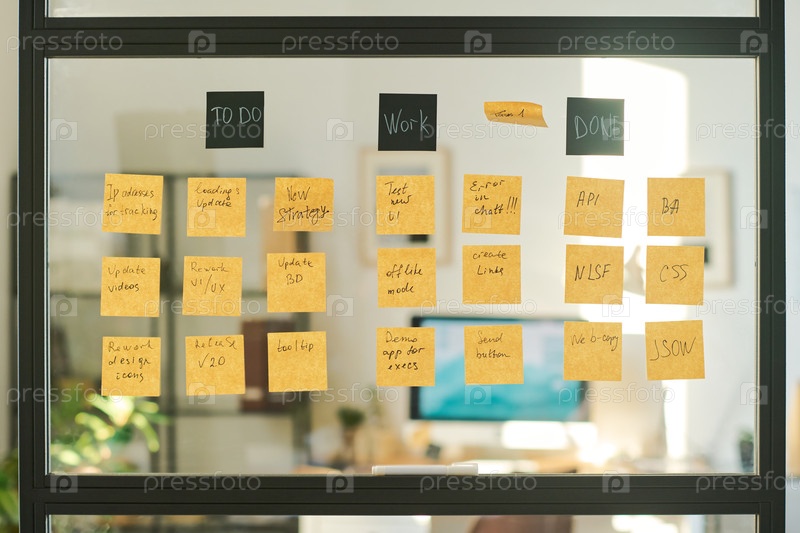 Организация рабочего процесса с помощью клейких записок на стеклянной стене в современных офисных условиях