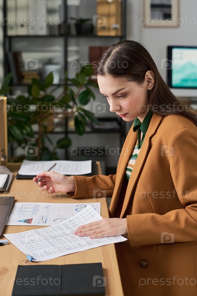 Молодая взрослая женщина анализирует финансовые документы на рабочем столе