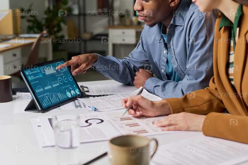 Молодой чернокожий мужчина и молодая женщина анализируют данные на цифровом планшете