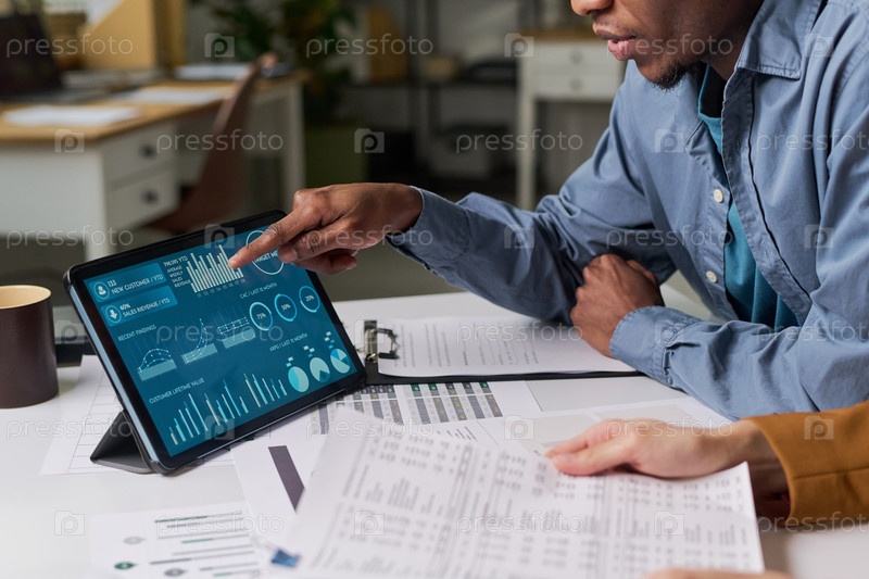 Молодой чернокожий мужчина объясняет коллеге финансовые данные на планшете