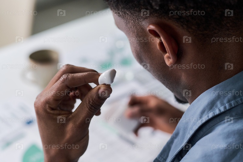 Молодой взрослый чернокожий мужчина изучает беспроводные наушники, сидя за рабочим столом