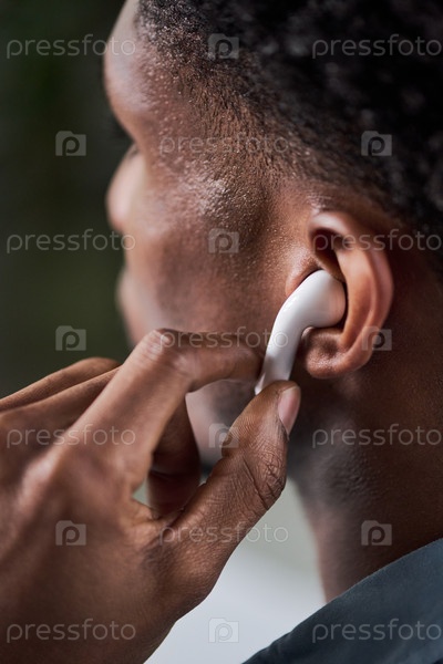 Молодой взрослый чернокожий мужчина регулирует беспроводные наушники, слушая музыку
