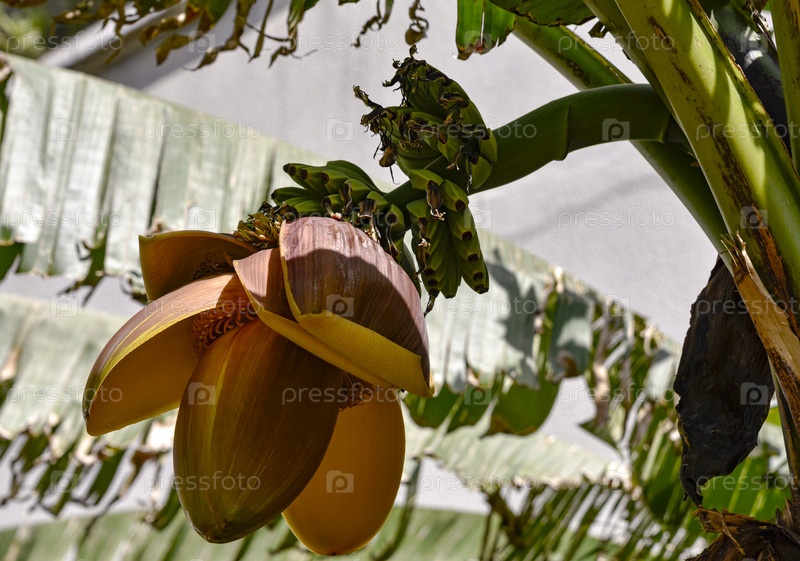 Яркий банановый цветок цветёт среди зеленых листьев