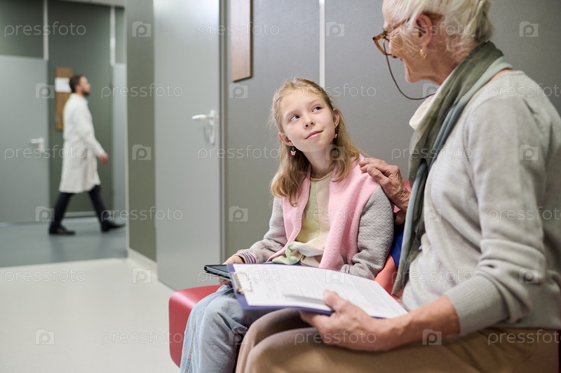 Пожилая женщина разговаривает с молодой девушкой в комнате ожидания больницы