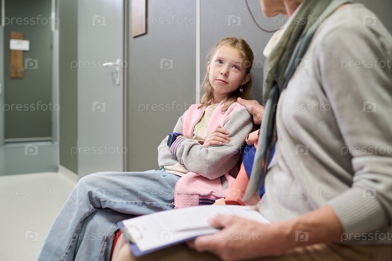 Девушка сидит с пожилой женщиной, ожидающей в коридоре больницы