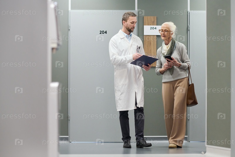 Мужчина среднего возраста врач консультирует старшую женщину в клинике