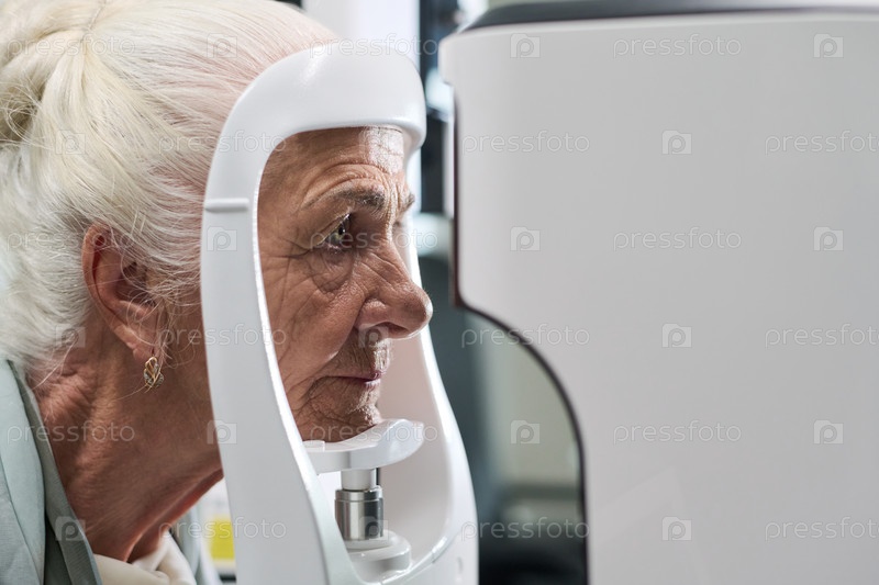 Старшая женщина, проходящая скрининг зрения с офтальмологическим оборудованием