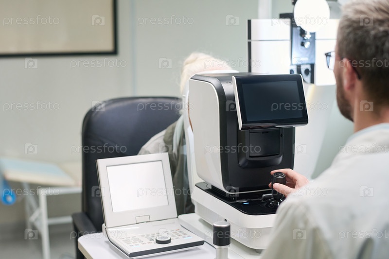 Женщина, проходящая осмотр глаз у старшего офтальмолога