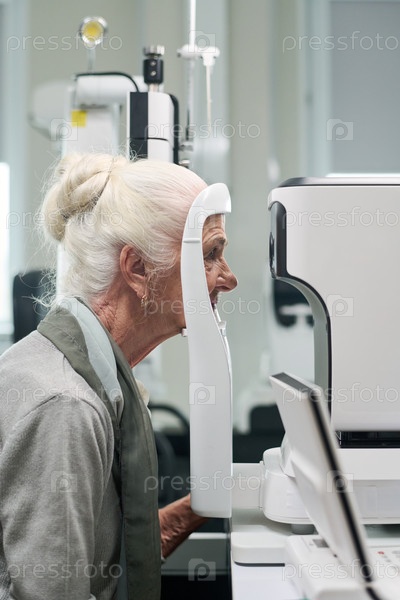 Пожилая женщина, проходящая обследование глаз с использованием медицинского оборудования