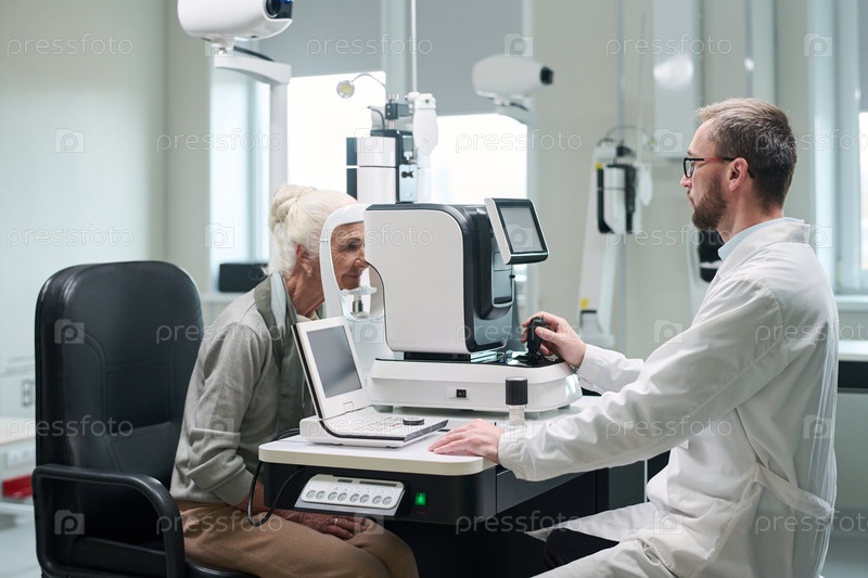 Старшая женщина, проходящая осмотр глаз у мужского оптометра