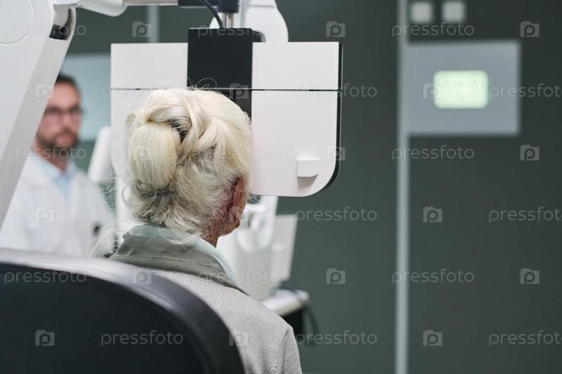 Пожилая женщина, проходящая осмотр глаз с помощью офтальмологического устройства