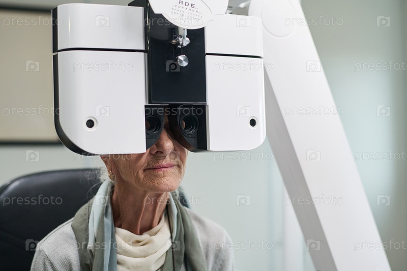 Пожилая женщина, проходящая обследование глаз с использованием устройства фороптера
