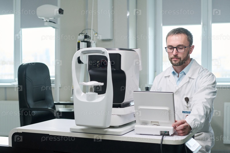 Мужчина среднего возраста, работающий с офтальмологическим оборудованием в клинике