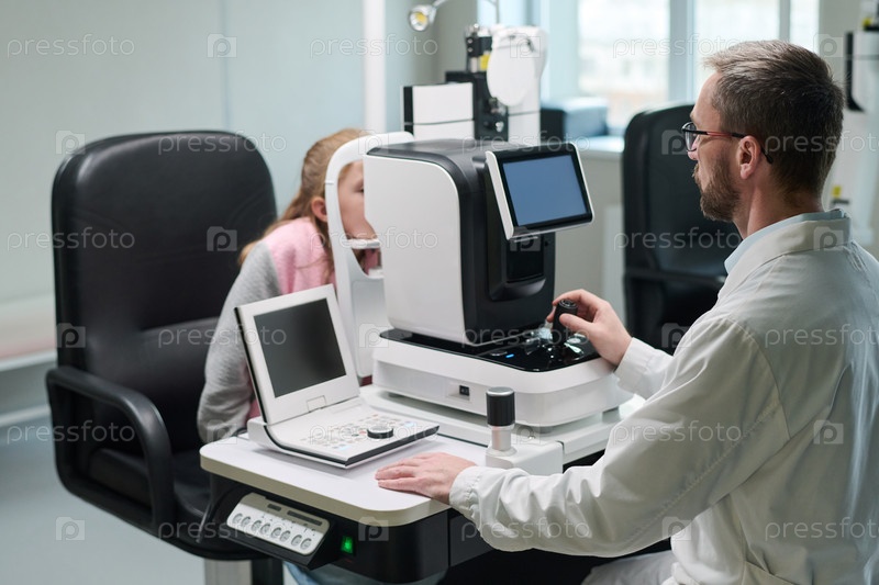 Девушка, проходящая осмотр глаз у оптометра с использованием медицинского устройства