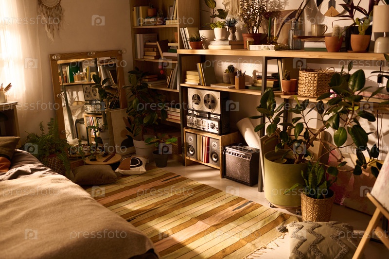Солнечный свет освещает уютную гостиную с комнатными растениями и винтажным аудиооборудованием